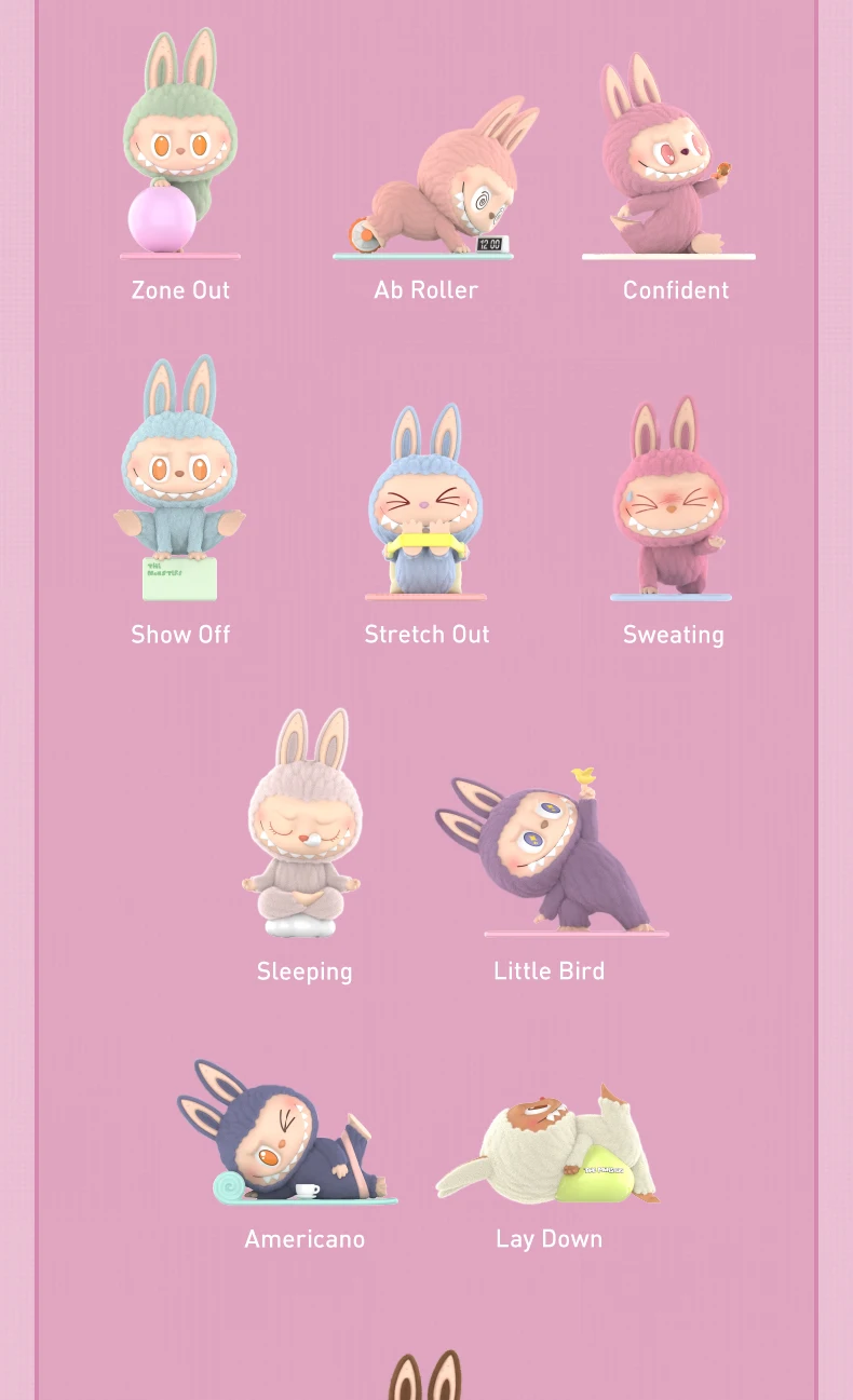 | Box Type | All 10 pieces, Random 1 piece, Zone Out, Confirm 10 styles, Confident, Ab Roller, Stretch Out, Show Off, Sleeping, Sweating, Americano, Little Bird, Hidden, Lay Down |