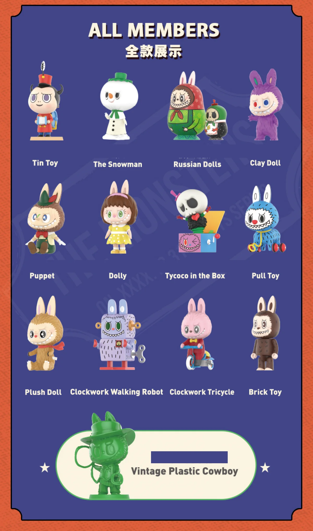 | Color | 12 Blind Boxes, 1 Blind Box, The Snowman, Tin Toy, Brick Toy, Tricycle, Hidden Style, Clay Doll, Russian Dols, Dolly, Puppet, Pull Toys, Tycoco in the Box, Walking Robot, Plush Doll |